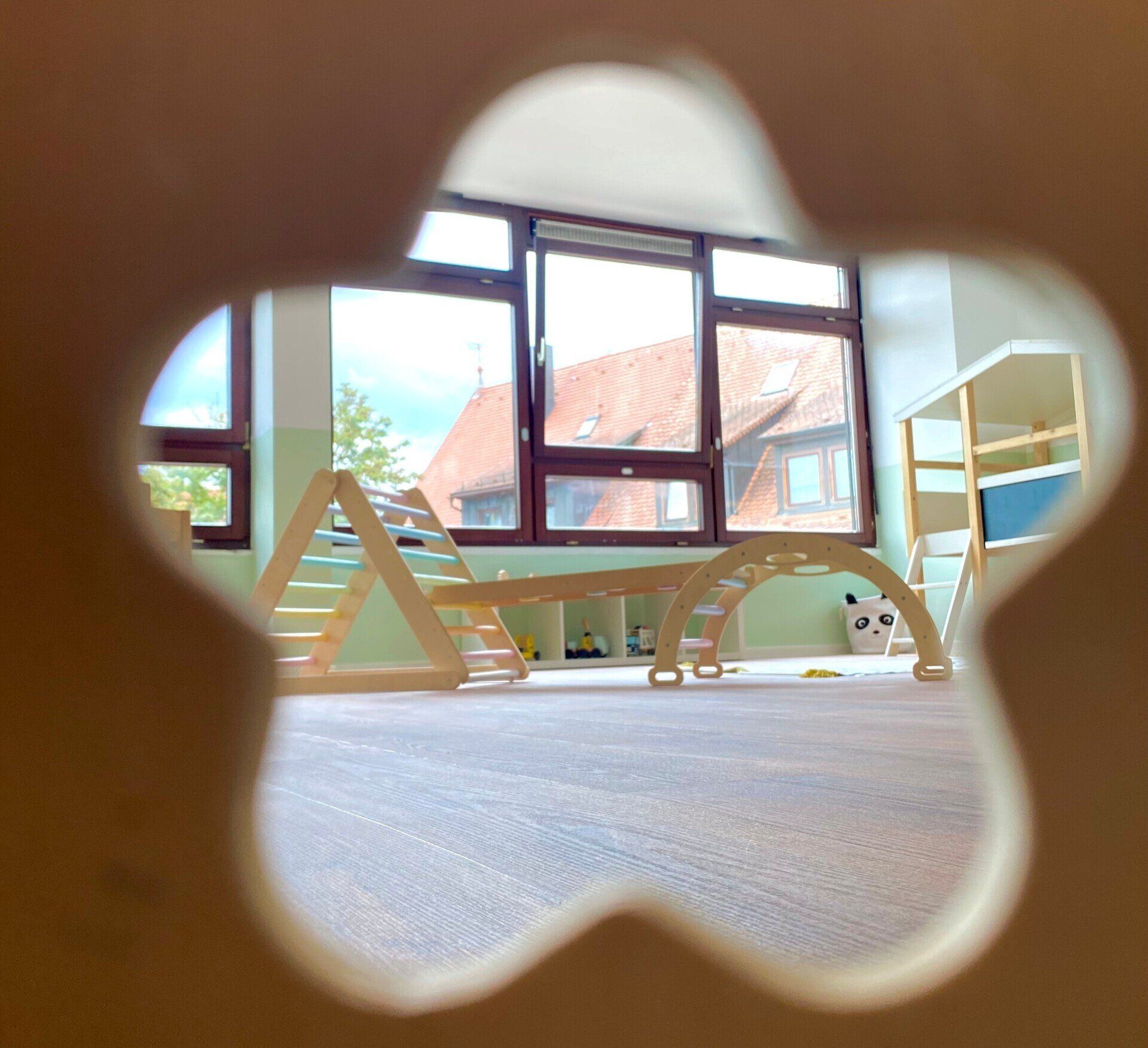 Das große Bewegungselement in Form eines Hauses können die Kinder selbst hochklettern und auch wieder runterrutschen. Die Kinder können hier auch entspannen beim gemeinsamen Bilderbuch Betrachten und Geschichten Lesen so richtig entspannen. In der Raummitte ist ausreichend Platz zum Spielen oder für unseren gemeinsamen Morgenkreis. Unseren Geburtstagskalender im Form eines Baumes können die Kinder immer sehen, wir können die Jahreszeiten an ihm besprechen und schauen ob es heute ein Geburtstagskind gibt.